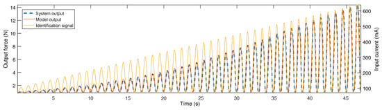 In this case, the identification signal is a current reference, that was ensured to be properly tracked by the controller. The output value is a signal from the force sensor.