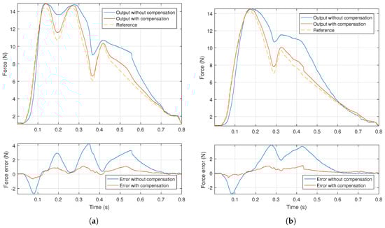 Force output by the system and error with and without hysteresis compensation, for each of the tested signals. (a) Bisfid pulse; (b) normal pulse.