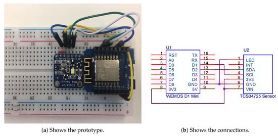 - Color light-to-digital converter with IR (Infrared Radiation) filter connected to a We-Mos D1 mini module (WEMOS, China) (ESP8266-based): This sensor allows for measuring the amount of lux in an office (1 lx = 1 lm/m), and it determines if the light is clear and the color in RGB format is obtained (Figure 1). This sensor has the IR blocking filter that minimizes the IR spectral component of the incoming light, providing much more accurate color measurements than those read by most sensors. The sensor also has an incredible 3,800,000:1 dynamic range with adjustable integration time and gain so it is suited for use behind darkened glass. This sensor works when connected to any microcontroller with IC and it can obtain four channel readings (red, green, blue and clear).