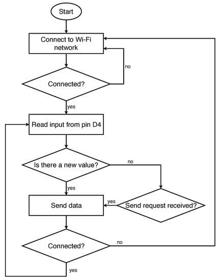 The device’s software has been developed in Arduino and its operation is described with the flowchart presented in Figure 3. Moreover, information is read synchronously, so that the status “Read input from pin D4” stops the execution of the software until new data is available in the input.