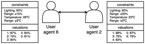 Given the data in this example and the characteristics of the two User Agents described above, if they had to negotiate, an agreement would be reached quickly. The reason for this is that User Agent 2 has obtained the lowest rating due to its very different lighting preferences. User Agent 6 and User Agent 2 are the most similar in terms of temperature, and even overlap in their range. In addition, their lighting preferences overlap by 80%. Therefore, the agreement reached by these two agents would be 80% in terms of lighting conditions and a temperature of 24.5 C. Despite this, the agreement must be reached between all active user agents that are participating in the negotiation, in the above case; therefore, the negotiation would continue with the rest of the agents.