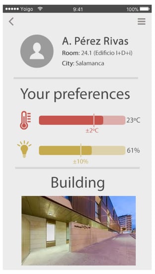 Each user in the environment (the environment is defined as every room in the building in which the system has been deployed) has an agent that retains their preferences. These preferences can be established on a mobile application specially developed for this system. The preferences include the following information: (i) lighting preferences in the working environment that are defined by a percentage value between 0 and 100, together with a threshold established somewhere between 5% and 10%; (ii) heating preferences in the working environment, defined by a value in degrees Celsius (C) together with a threshold of between 2 and 5 C; (iii) a schedule, with the possibility of determining preferences (i) and (ii) for each time zone; and (iv) three types of user profiles in negotiations, which may be safe if the user wants the environmental conditions to suit their preferences, economic if the user prefers to consume as little as possible or neutral if the user wants a balance between their preferences and energy-saving measures, this enables the system to diverge a little from these preferences. The use of these three profiles allows the system to avoid a negotiation situation that does not allow the correct establishment of a comfort preference agreement.
