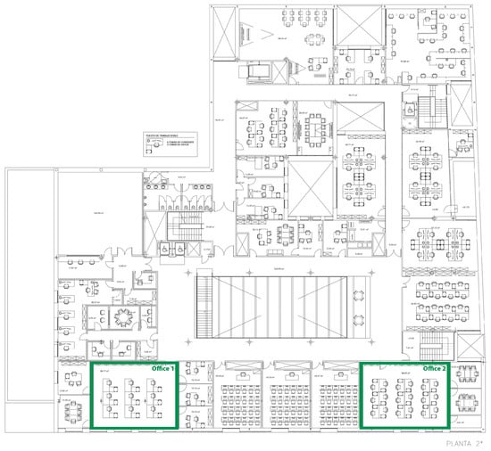 Plan of the building in which the two offices in which the case study was carried out are located. Office 1 is the control group and Office 2 is the experimental group.
