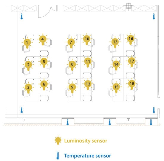 Figure 9 shows how the sensors used for data collection are deployed in one of the offices. A presence sensor was installed at each workstation, an outdoor temperature sensor on each window and an indoor temperature sensor in each corner of the office.
