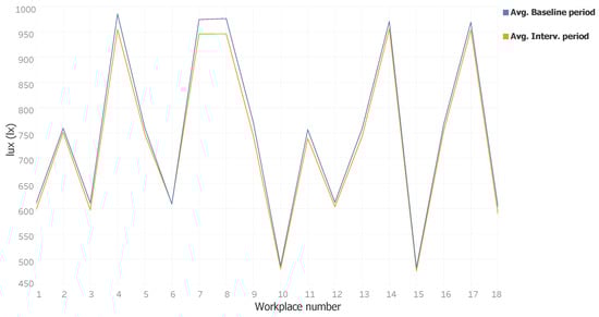 In Table 5, we can see the average light intensity values for each workstation during the case study. We can see a slight decrease in the values collected during the Intervention Period. This is because, in the Baseline period, users established their lighting values above their minimum light intensity preferences. Then, when negotiations have taken place with the system, the system was able to decrease the light intensity per station a little, which has a knock-on effect on the consumption of electricity. Figure 10 shows a more visual comparison of the average values from the two periods. It can be seen how the reduction of light intensity per workstation was slightly lower at all workstations and almost unnoticeable.