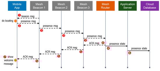 - Mesh Router: a gateway device between the Bluetooth beacon network and the rest of the network. It is responsible for collecting the presence messages from the Mobile Apps within the range of the Bluetooth beacon network. Once the Mesh Router receives a presence message, it will upload the presence state to the Application Server through hypertext transfer protocol (HTTP), and send an acknowledgement message back to the Mobile App in response to receiving the presence message from a specific user.