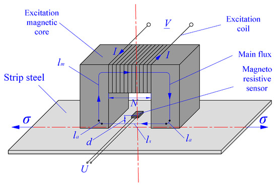 where indicates the inherent attribute of ferromagnetic material for strip steel, which is related to the saturated magnetic flux density , the saturated magneto-strictive coefficient , and magnetic permeability under unstressed conditions of strip steel materials. Equation (1) is the common theoretical principle for all internal stress detection technologies using the magneto-elastic effect.