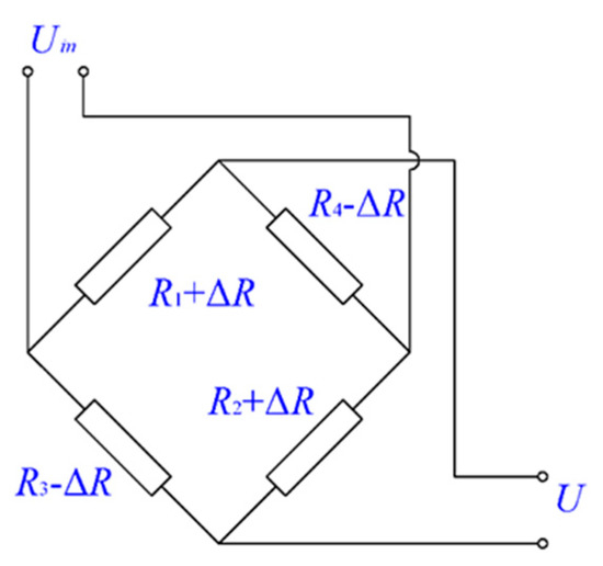 The signal conversion process of ΔBr→ΔR→ΔU is completed within the magneto-resistive sensor. The general internal structure of GMR and TMR sensors is Wheatstone bridge (Figure 3), which includes four magnetoresistance sensors with a same resistance. The relationship between the resistance value of the magnetoresistance sensor ΔR and ΔBr is given by Equation (9):