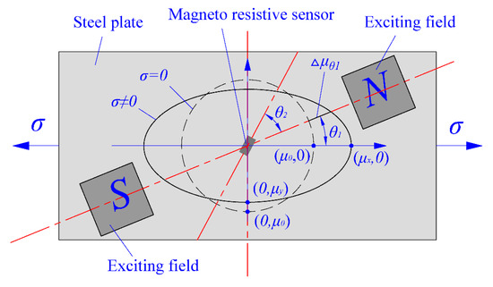 According to real-life industrial strip steel production, the internal stress state during detection process is always maintained in a uniaxial tensile state in the longitudinal direction of the strip steel. So, taking the longitudinal direction of strip steel as the base orientation, assume the included angle between the main flux direction of the excitation field and strip steel length is , and the included angle between the detection direction of the magneto-resistive sensor and the main flux direction of the excitation field is . According to the findings in the literature [9,10], the magnetic permeability of ferromagnetic materials is uniformly distributed in a circular profile in all directions under an unstressed condition. Its expression is described in Equation (13), where indicates the magnetic permeability under an unstressed condition. Magnetic permeability of ferromagnetic materials is distributed in an ellipse profile under uniaxial tensile stress conditions. Its expression is described in Equation (14), where and indicate magnetic permeability in the long axis and short axis direction of ellipse, respectively (Figure 4):