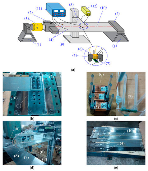 Composition and structure of experimental device for stress detection: (a) Structure diagram of experimental device; (b) Fixed method of detected strip steel; (c) Exciting magnetic core and magneto-resistive sensor; (d) Installation method of exciting magnetic core and magneto-resistive sensor; (e) Detected strip steel and strain gage. The device components include: (1) supporting frames, (2) clamping plates, (3) hydraulic cylinder, (4) strain gauges, (5) magnetic core, (6) excitation coil, (7) magneto-resistive sensor, (8) supporting plate, (9) guide rail, (10) strip steel, (11) data acquisition instrument, and (12) power supply.