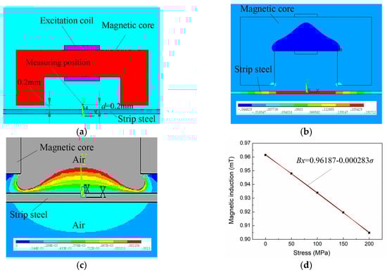 The distribution of the magnetic induction surrounding strip steel is shown in Figure 6c, which shows that the magnetic induction surrounding strip steel ranges from 0.2 to 1.3 mT and increases with the increase in the vertical distance d of strip steel. The distance d between the detection point of the sensor and the strip steel was set to 2.0 mm, variations in the magnetic induction for the detection point with stress variations is shown in Figure 6d, which indicates that the magnetic induction for the detection point decreases linearly with the increase in internal stress. Through the linear fitting of the simulated data, the conversion coefficient between the variable quantity of internal stress and the variable quantity of the magnetic induction for the detection point was 0.000283 mT/MPa (2.83 mOe/MPa).