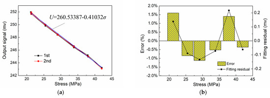 Detection error and repeatability analysis: (a) stress detection signal and fitting straight line; (b) detection error and fitting residual.