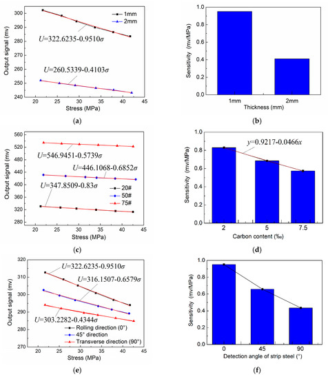 For the practical production of strip steel, the main objective of detecting internal stress is to ensure the uniform distribution of internal stress at all positions to subsequently guarantee the final strip shape. Therefore, precisely measuring the internal stress differences at different positions on the same strip steel is the most important requirement for stress detection rather than obtaining the absolute value of internal stress. To accurately measure the difference in internal stress, the sensitivity of the detection signal must be accurately calibrated. Therefore, the effects of different influencing factors on signal sensitivity of stress detection are mainly discussed in this section.