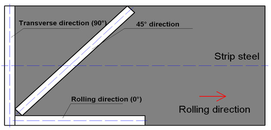 Figure 8a shows the detected results of strip steel with different thicknesses: one mm and two mm. The range of internal stress was 20 to 45 MPa. The stress detection was performed along the rolling direction under the same detection conditions listed in Table 4. As can be seen in this figure, the output value of the one mm detection signal was greater than that of the two mm strip steel. The sensitivity of the stress detection signal sharply decreased, which indicates that the internal stress of strip steel with a decreased thickness value is sensitive to the exciting field. In terms of strip steel with a greater thickness, the excitation parameters of the system, such as exciting current, should be increased to increase the sensitivity of the detection system. Strip steel with a thickness of one mm with different carbon contents, 2‰ (20# steel), 5‰ (50# steel), and 7.5‰ (75# steel), were subjected to a stress detection experiment along the rolling direction under the same detection conditions listed in Table 4. The results are shown in Figure 8c,d. The output value of the detection signal under the same stress level increased with an increase in strip steel carbon content. However, the sensitivity of the detection signal gradually decreased. Moreover, a monotonically decline relationship exists between sensitivity and carbon content. The sensitivity of stress detection decreased by 0.0466 mv/MPa with a 1‰ increase in strip steel carbon content. Therefore, to reach a certain stress detection sensitivity in the actual production process, the carbon content of a specific detected strip steel must be considered. In the production of strip steel, material undergoes considerable cold plastic deformation during cold rolling. The crystal form texture along the plastic deformation direction and preferred orientation of the crystal with certain directions were generated. The preferred orientation of the crystal significantly influences the magnetic anisotropy of ferromagnetic materials [30]. Although the internal stress detection of strip steel during industrial production is performed along the rolling direction, research on characterizing the stress detection signal for strip steel in different directions still has general theoretical importance and contributes to guiding the design of detection systems. Specimens of detected strip steel were cut on Q235 strip steel with the same thicknesses of one mm, and material along the rolling direction (RD), transverse direction (TD), and 45° (Figure 9) were subjected to stress detections under the same detection conditions listed in Table 4. The results are shown in Figure 8e,f, which show that the specimen of strip steel along the RD had the maximum output value for the detection signal and the maximum sensitivity. The transverse strip steel specimen had the lowest output value for detection signal and the least sensitivity; the output value and sensitivity the strip steel specimen along 45° was medium. In comparison with thickness and carbon content, although the output value of the detection signals for the three specimens had no considerable difference (the maximum output value was 315–290), the sensitivity of the same strip steel in different directions differed significantly. Therefore, stress detection direction must be strictly guaranteed along RD in actual detection processes. Otherwise, certain error may be generated due to the sensitivity of strip steel along different directions. We showed that the sensitivity is significantly dependent on the crystal orientation of the stress detection signal. The crystal orientation degree is related to the production process parameters of the strip steel, such as rolling reduction and annealing temperature [30,31,32]; therefore, the stress detection system must be recalibrated when the production process parameters of the strip steel with the same thickness and carbon content are changed. Finally, the experimental results showed that the detection principle can be used to detect internal stress and identify crystal orientation information of materials, so the detection principle could potentially be applied to detect crystal orientation through magnetic anisotropy.