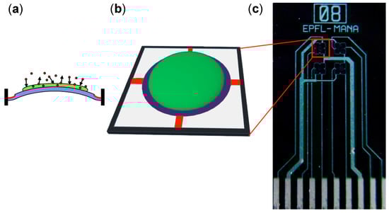 (a) Schematic illustration of the side view of the membrane. Blue, green, and red parts correspond to substrate, receptor layer, and embedded piezoresistors, respectively. (b) Schematic illustration of sensor channel. (c) Optical microscope image of a membrane-type surface stress sensor (MSS) chip.