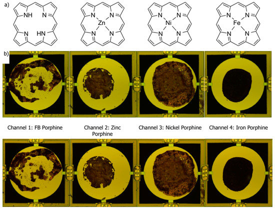 Porphine-based receptor materials coated on MSS channels. (a) Structures of free-base and metal coordinated porphines; (b) Optical microscope images of each MSS channel coated with porphines before (upper) and after (bottom) gas sensing measurements. Channel 1, free-base (FB) porphine; Channel 2, zinc porphine; Channel 3, nickel porphine; Channel 4, iron porphine.