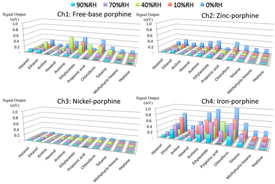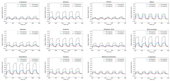 Figure 3 shows the typical sensing signals obtained through the measurements (10% in partial vapor concentration, 0% RH, 25 °C). Only the last five cycles were used for analysis because the first few cycles tended to be disturbed by the history of the previous measurement. The baseline was subtracted for every signal so that the signal output at 180 s becomes 0 mV. For free-base porphine, two main features can be seen from Figure 3. Firstly, free-base porphine was highly sensitive to most of the oxygen-containing molecules. Secondly, free-base porphine showed the highest sensitivity to toluene among the hydrocarbons. These two features can be attributed to the two different interactions between the porphines and gas molecules. One was the hydrogen bonding with the central NHs, which contributes to the high sensitivity to oxygen-containing molecules. The other is the aromatic interaction with the peripheral pyrroles of porphines, resulting in the high affinity to toluene.