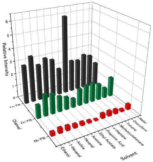 The sensing properties of porphine were significantly changed by metal insertion. For almost all the measured gases, the sensitivity of the metalloporphines followed a general trend: nickel < free-base ~ zinc < iron porphines. Figure 4 shows the relative intensity of each metalloporphine to free-base porphine. The signal intensities of the four porphines to the sample gases are shown in the Supplementary Materials (Figure S4). By replacing the central hydrogen atoms with a metal ion, the dominant interaction between a gas species and a metalloporphine becomes the coordination interaction with the central metal ion. To the hydrocarbons, which have no lone pairs or hydrogen bonding sites, the metalloporphines showed similar selectivity as free-base porphine. Toluene showed the highest intensity because of the aromatic interaction between its benzene ring and the peripheral pyrroles of a porphine. Among the three metals, nickel insertion drastically reduced the signal intensity. In general, most of oxygen-containing molecules could bind to the center metal ion in nickel porphyrins with substituents, as the substituents could act as electron withdrawing moieties, which enhanced binding affinity to the axial coordination of nickel [34]. In contrast, the nickel center in porphine did not show strong coordination with gas molecules because a porphine molecule has no substituents; the lack of withdrawing moieties led to a change in the coordination structure from a pyramidal geometry to a square-planar geometry, which showed no axial coordination.