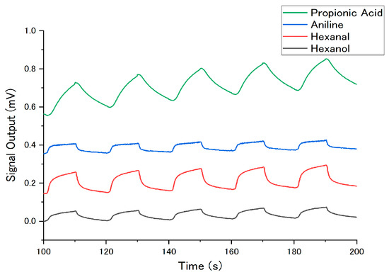 Sensing signals to propionic acid at 25 °C, 2% in partial vapor pressure, 70% RH. The last five cycles of sample gas injection and nitrogen gas purge are shown.