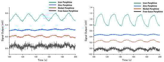 Zinc porphine showed similar signal intensity to free-base porphine (Figure 4). However, it can be seen from Figure 4 that the intensity ratio slightly deviated from 1.0, reflecting the altered porphine-gas interaction by zinc insertion. Zinc porphine generally had a strong pentadentate coordination mode, which allowed one axial ligand to be complexed to the central zinc atom [35]. When two ligands were coordinated to the zinc center, zinc porphine showed a six-coordinated structure with two axial ligands, in which the binding energy of a second complexation was much lower than that of the first [36]. Thus, it was more likely that zinc porphine took up only one axial ligand when the concentration of a sample gas was low. Compared to free-base porphine, zinc porphine exhibited slightly different intensity owing to its different electronic structure. Alcohols and amines have lone pairs, which favor axial coordination with the zinc porphine. This effect prevails over hydrogen bonding with free-base porphine, leading to the higher intensity of the zinc-porphine for the alcohols and aniline than free-base porphine [37,38,39,40,41].