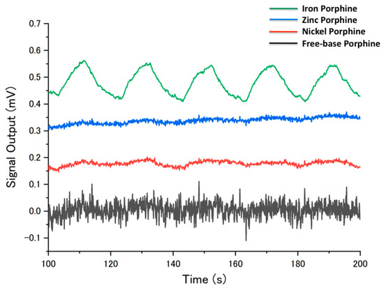 All chemicals were purchased from Tokyo Chemical Industry Co. Ltd., Sigma–Aldrich Co., Wako Pure Chemical Industries, Ltd., Kanto Chemical Co. Ltd., and Nacalai Tesque, Inc. The porphines were synthesized with reagent grade or higher grade chemicals, which were used as received. For gas sensing measurements, pure water, ethanol, 1-hexanol, hexanal, n-heptane, methylcyclohexane, toluene, ethyl acetate, acetone, chloroform, aniline, and propionic acid were purchased as analytical grade chemicals and used as received. As the center metal ions, nickel, zinc, and iron were selected owing to their distinctive coordination [27] and hydration properties [28]. Free-base porphine and nickel-, zinc-, and iron-metalloporphines were synthesized according to the literature [29,30,31,32,33]. The porphines were characterized by 1H Nuclear Magnetic Resonance (NMR) measured with a JEOL AL 300 FT-NMR spectrometer using tetramethylsilane (TMS) as an internal reference.