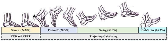 The periodic action of pedestrian walking is called gait, and each gait cycle can be divided into four phases: stance phase, push-off phase, swing phase, and heel-strike phase [,], as illustrated in Figure 1. The percentage of time involved in the stance phase, push-off phase, swing phase, and heel-strike phase is approximately 24.8%, 20.5%, 38.0%, and 16.7%, respectively [,].