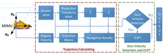 The pedestrian-positioning method based on the foot-mounted MIMU installs the sensor on the foot of pedestrians, so the trajectory information is obtained through the acceleration and angular velocity measured by the MIMU during the foot movement. Furthermore, the zero-velocity detector (ZVD) and ZUPT method are used to correct the calculation error of the positioning system to improve the positioning accuracy. The basic principle of the dead reckoning algorithm based on the ZUPT is shown in Figure 2.