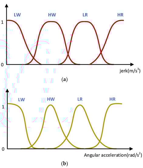 The knowledge base includes the database and fuzzy library rules. The database stores the membership function values of all fuzzy subsets of the input and output variables and is responsible for providing data to the fuzzy inference engine in the fuzzy relational operation of fuzzy rule inference. The fuzzy rule base is used to store fuzzy control rules and provides the fuzzy inference engine with control rules during fuzzy inference. In this paper, the jerk membership function and angular acceleration membership function are shown in Figure 5.