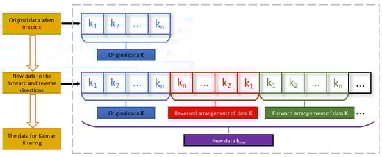 First, the data interval of pedestrian zero velocity is determined by the ZVD; i.e., we obtain the data k1, k2, …, kn in Figure 7 and name the data ; at time n, we process the data as shown in Figure 7, reversed arrange the data in chronological order, named data (kn,…, k2, k1,); then, we alternately arrange data and data to form new data , which are introduced as the MIMU measurements on the foot zero-velocity status. According to the method in Section 2.2, the new data are used to correct the positioning error based on dead reckoning. The data can be reorganized because the velocity of the foot is zero at this time. However, the forward and reverse directions are used here to ensure the continuity of the measurement noise. The specific calculation process is shown as follows: