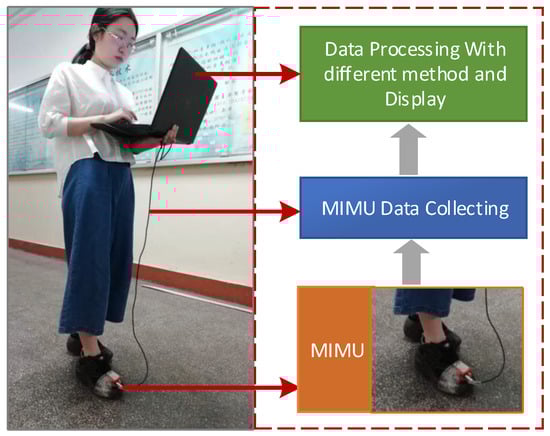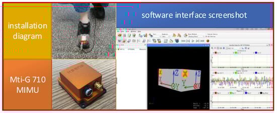 The MTi-G710 MIMU integrates multiple sensors including accelerometers, gyroscopes, magnetometers, barometers, and GPS receivers. The MIMU is firmly connected with the foot in this experiment and the sampling frequency is 100 Hz. The device picture, installation position, and the corresponding software interface screenshot are shown in Figure 8. The MTi-G710 MIMU is used to collect the output of the accelerometers and gyroscopes and calculate the positioning results of the pedestrian in real time. The pedestrian-positioning test structure diagram is illustrated in Figure 9.