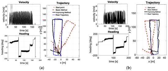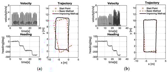 The pedestrian-positioning test result curves in Table 3 are illustrated in Figure 11. The changing curves of velocity and heading are used to describe the test state. Trajectory curves of pedestrian positioning based on the traditional zero-velocity update and the proposed method are used to compare the principle correctness and improvement effect.