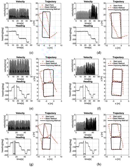 As shown in Figure 11, compared with the pedestrian positioning based on the traditional zero-velocity update, the proposed method effectively improves the pedestrian-positioning accuracy. Specifically, for fast walking (the maximum velocity is 4 m/s) in the same route (as shown in Figure 11a,c,e,g), a longer walking distance corresponds to a larger cumulative error of pedestrian positioning based on the traditional pedestrian-positioning method, whereas the positioning accuracy of the proposed forward and reverse calculation method based on the adaptive zero-velocity interval adjustment algorithm increases. For different velocities in the same route (as shown in Figure 11b,d,f,h), the improved effect of positioning is not obvious as the improved effect of the uniform fast walking test. The positioning accuracy is also significantly improved compared with the traditional positioning method because the velocity change motion is divided into two parts: slow walking (the maximum velocity is 3 m/s) and fast walking (the maximum velocity is 5 m/s). Slow walking does not pose a threat to the traditional positioning methods, i.e., when the maximum velocity is approximately 3 m/s, the traditional pedestrian-positioning method is less affected in terms of the positioning accuracy. The trajectories of the two methods in the first half of walking are consistent, as shown in Figure 11b,d,f,h. However, when the walking velocity increases (the maximum velocity is approximately 5 m/s), the applicability of the traditional pedestrian-positioning method deteriorates, and the positioning error rapidly increases. At this point, the proposed positioning method with forward and reverse calculation based on the adaptive zero-velocity interval adjustment algorithm has significantly improved the positioning accuracy. Thus, the proposed adaptive zero-velocity interval solution can effectively adjust the length of the interval adaptively and is suitable for different velocities.