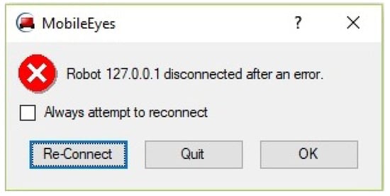 After entering the “Robot Servers” hostname, the user clicks the “Connect” button to access the robot over the network. The connection to the server that is running on the robot may then be canceled by clicking the “Quit” button. If MobileEyes cannot connect with the robot after a few seconds, it may show a message of why the connection failed and then try to reconnect again. One feature of MobileEye is that if it loses connection during a session with the server, it will give a message and an option to reconnect without having to stop and restart the GUI as shown in Figure 3. This feature is useful because it makes MobileEyes easier to use; however, it can be utilized by an attacker as a vulnerability or possible threat (e.g., in a man-in-the-middle (MITM) attack).