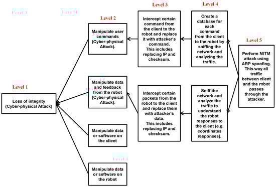 Most of the traffic sent from the client to the robot are commands; however, most of the traffic sent from the robot to the client are data and feedback of certain tasks. Both integrity attacks in the tree start by performing a MITM attack through Address Resolution Protocol (ARP) spoofing on the robot and the client as indicated by Level 5. This requires the attacker to be on the same network as the robot and the client. In other words, the attacker is either a trusted insider or an outsider who managed to hack into the network. Level 4 of the attack tree shows that the attacker can analyze the packets and distinguish certain commands (e.g., movement commands) and data (e.g., coordinates and responses) by sniffing the traffic between the robot and the client.