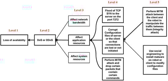 A good representative example of an integrity attack would be if a user is teleoperating a robot using MobileEyes (see Figure 5) and wants the robot to turn left, but a MITM attacker intercepts this command and forces the robot to turn right instead. In this case, there is a chance of physical damage to occur including falls or collisions. Other integrity scenarios are also possible. In Figure 6, we show an attack tree that demonstrates different branches of attacks based on a MITM attacker that can lead to the loss of integrity, which represents the ultimate objective of the attacker as demonstrated by Level 1 of the attack tree. The loss of integrity is achieved by manipulating the communication stream between the client (user using MobileEyes) and the server (robot) to cause cyber-physical impacts. More details on the cyber-physical impacts or consequences are given in Section 4.3. The branches of the tree represent the ways and techniques through which the attacker can achieve the ultimate goal. The arrows in the attack tree indicate the sequence through which each attack proceeds. The presented attack tree is not inclusive, meaning it does not cover all possible ways to achieve loss of integrity.