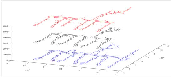 2D line map of the indoor hallways in three floors (first, second and third) of the engineering building at our university. Units are in mm. The map in blue, black, and red colors are for the first, second and third floors, respectively. The position of the red asterisk represents the (0, 0, 0) coordinate.