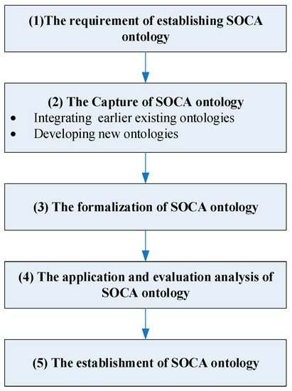 Figure 1 shows the SOCA ontology methodological architecture. On the basis of the steps of the skeletal methodology, this architecture comprises five stages:
