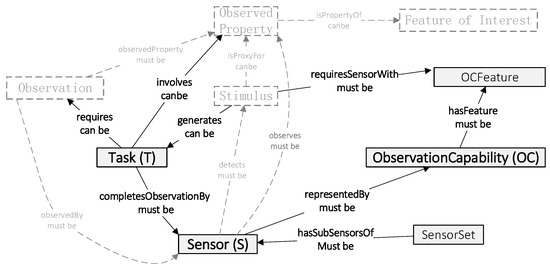 The SOCA ontology is centered on sensor observation capability concepts for the sensor selection domain in one particular observation task rather than a generic notion that includes observations, features, and properties. The task-sensor-observation capability (TSOC) ontology design pattern, which is presented in Figure 2, aims to accurately represent all kinds of sensor observation capability ontologies and vocabularies for the associated selection of multiple sensors in a certain observation task. The pattern follows the principle of minimal ontological commitments to make it extensible for a deeper-level observation application but focuses on facilitating sensor selection in one observation task. As shown in Figure 2, our TSOC ontology pattern is related to and expanded from the SSN ontology. The solid boxes and arrows are our proposed TSOC ontology. The dashed boxes and arrows represent the ontologies contained in the SSN ontology framework.