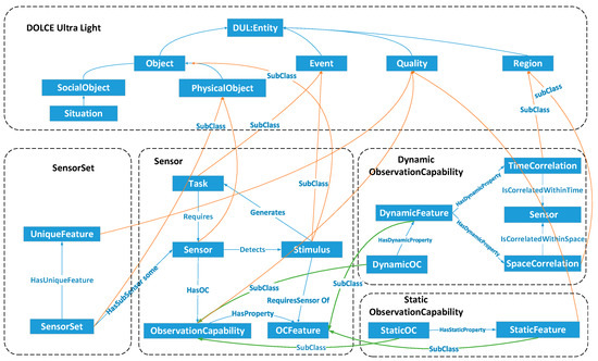 The SOCA ontology revolves around the central TSOC pattern (see the description in Section 2.2.2). Several conceptual modules build on the pattern to cover key sensor observation capability concepts. To assist knowledge engineers and users in interpreting the SOCA ontology, we align it to the DOLCE Ultra_Light (DUL) foundational ontology, which has been the top ontology of the engineering cognitive domain and in linguistics [49]. The DUL ontology defines 29 classes and 43 properties [50], including Entity, Event, Object, Quality Region, and Situation. Figure 3 shows the SOCA ontology modules, DUL-aligned core classes and relations, which will be detailed in the following sections.