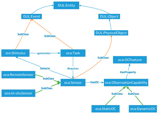 Since the oca:Task and ssn:Stimulus are viewed as the representation of one particular event, the SOCA class oca:Task can be defined as a subclass of DUL:Event; the same applies to ssn:Stimulus. Sensors have observation capabilities for different subclasses such as remote sensing (oca:RemoteSensor) and in situ (oca:In-situSensor) sensors.