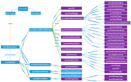 This work focuses on the observation capability ontology of remote sensing sensors. Based on our established remote sensing sensors’ observation capability metadata model [5], four aspects in oca:StaticOC for remote sensing sensors have been further reformed (Figure 5): oca:ObservedBreadth&Depth, oca:ObservedFrequency, oca:ObservedTheme, and oca:ObservedData. oca:ObservedBreadth&Depth refers to the basic observation features derived from the horizontal and vertical scales of sensor observation capability, including oca:FOV, oca:swingRange, oca:OpticalSpectralFeature, oca:RadarSpectralFeature, oca:GroundResolution, oca:NadirResolution, oca:RadiationResolution, oca:Accuracy and so on. oca:ObservedFrequency is derived from the timescale dimension because evaluation of the time efficiency of sensor observations is important. oca:ObservedFrequency mainly includes the revisited observation cycle oca:RevisitCycle. oca:ObservedTheme presents the intended applications of the available satellite sensors, including oca:observedParameter and oca:potentialApplication. oca:ObservedData of remote sensing satellite sensors has subclasses of oca:RSImageData used to meet the specific requirements of sensor planners for observation results.