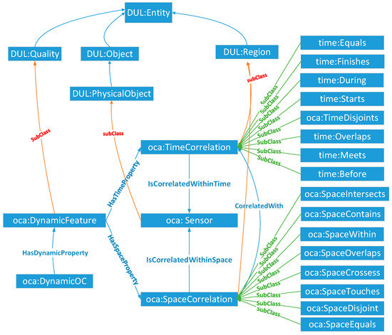 The DynamicOC module of SOCA ontology is similar to the StaticOC module, which is a subclass of DUL:Quality. As shown in Figure 6, oca:DynamicOC refers to the dynamic spatial-temporal observation features according to the real observation scene. oca:DynamicOC uses HasTimeProperty and HasSpaceProperty relations and establishes two dimensional features: oca:TimeCorrelation and oca:SpaceCorrelation. The oca:TimeCorrelation and oca:SpaceCorrelation properties in the oca:DynamicOC class represent the spatial-temporal relations among different sensors and have different constituents. Because entities that have a DUL:hasConstituent property must be a DUL:Region [50], oca:TimeCorrelation and oca:SpaceCorrelation are the subclasses of DUL:Region. Following the nine-intersection model [51] of geographical information science for interpreting spatial topological semantics, and also referencing the existing spatial relationships (i.e., equals, disjoint, intersects, touches, crosses, overlaps, within, and contains) that are standardly defined in OGC simple feature access specification [52], oca:SpaceCorrelation reuses the existing spatial relationships including oca:SpaceEquals, oca:SpaceDisjoint, oca:SpaceIntersects, oca:SpaceTouches, oca:SpaceCrosses, oca:SpaceOverlaps, oca:SpaceWithin, and oca:SpaceContains. Similarly, the topological temporal relations of oca:TimeCorrelation can be reused from the current time ontology recommended by OGC/W3C [53], including time:Equals, time:Finishes, time:During, time:Starts, time:Overlaps, time:Meets, and time:Before.