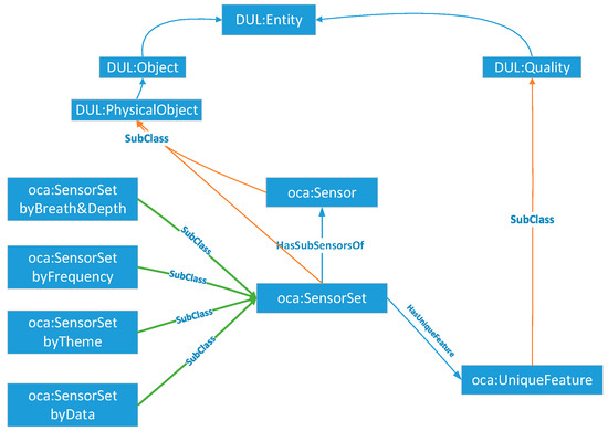 Since similarities exist among the static observation capabilities of different sensors, such as the spatial resolution of two sensors being better than 250 m and all having the water boundary extraction application, the SensorSet module performs as a package to carry the association relationships among those sensors. As shown in Figure 7, the core class oca:SensorSet is composed of a series of association sets (oca:SensorSetbyBreadth&Depth, oca:SensorSetbyFrequency, oca:SensorSetbyTheme and oca:SensorSetbyData) made by the comparison among one of the same dimensions of oca:StaticOC (oca:ObservedBreadth&Depth, oca:ObservedFrequency, oca:ObservedTheme, or oca:ObservedData) of the sensors. Each oca:SensorSet record has its oca:UniqueFeature, which is used to represent one unique association relationship among certain sensors.