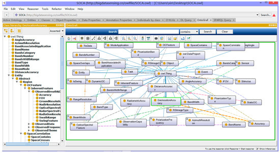According to the ontology definition in Section 2.2.3, this section demonstrates the establishment of the SOCA ontology by using the Protégé ontology editor (Figure 8). Then the SOCA ontology in the OWL is generated, which can be viewed at http://bigdatasensing.cn/owlfile/SOCA.owl. In addition, the reviewer can on-demand check the ontologies according to the modules, classes and relationships from the website http://www.bigdatasensing.cn/SOCA.html.