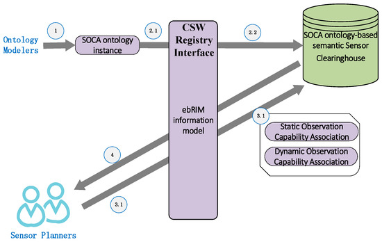 As shown in Figure 9, four steps are involved to complete the observation capability semantic association. The first is to establish the SOCA ontology-based RDF instance. Ontology modelers can establish the remote sensing satellite sensors’ SOCA ontology-based RDF instance or convert SensorML-based remote sensing satellite sensors’ observation capability information model into a SOCA ontology-based RDF instance such as http://bigdatasensing.cn/RDFInstance/AVHRR3-NOAA.rdf. CSW is a representative and widely accepted registry service that has specific registry information models such as the ebXML Registry Information Model (ebRIM) [54]. In this research, the ebRIM-based CSW registry service was adopted. The second step is to convert the RDF-based SOCA ontology instance to the ebXML Registry Information Model (ebRIM); then, the ebRIM-based SOCA ontology instance can be directly stored into an ontology database such as the Oracle Database to form a semantic sensor clearinghouse. In this step, the related technologies, such as the mapping of the RDF-based ontology description to ebRIM, the semantic storage and registry, have been elaborated in our previous research, [55,56]. The third step is based on the GetRecords operation in the CSW specification; the sensor planners can enter a compound query on demand according to the observation requirements of the monitoring task. Additionally, the crucial process of the observation capability association is needed, which will be analyzed in detail below. After the processes of the Jena engine-adopted ontology reasoning and SPARQL-based querying, the last step is to return the multi-sensor association results to the sensor planners.