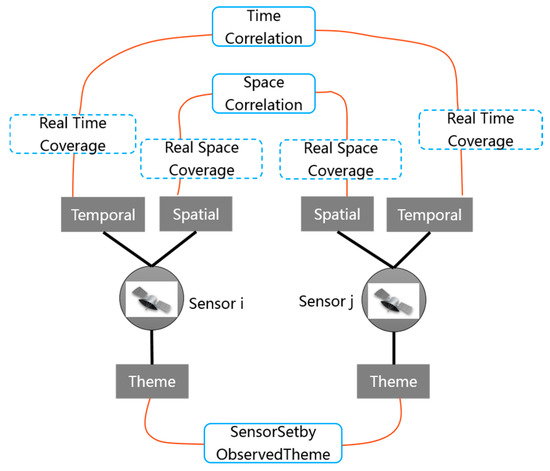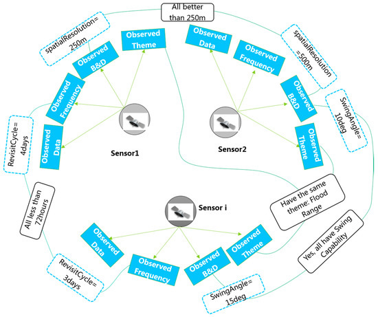 Since the association among the different sensors in one observation application exists, a SensorSet is designed as a container to assemble those sensors and present their observation capability association records. For example, sensor i and sensor j are the flood observation-supported satellite sensors with the same observation resolutions; their images can be used to extract the flood area, and their ground resolutions are all better than 500 m; in this case, there are some observation capability association records that can be loaded in the SensorSet.