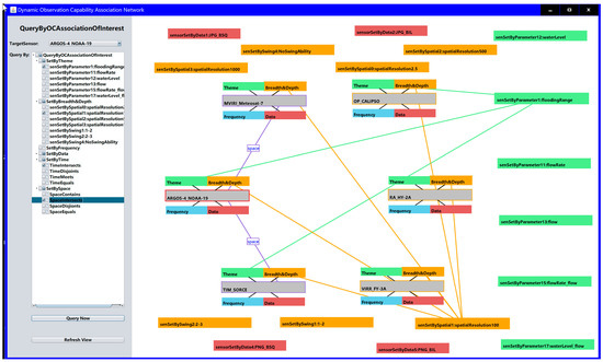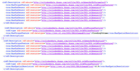 Because of the advantages of the structural characteristics of the Resource Description Framework (RDF), we can formalize the static association results by the RDF, which also enables the establishment of semantic indexing. As expressed by the RDF in Figure 11, the association information (such as that sensor 9, sensor 18, sensor 16, sensor 15, sensor 2 and sensor 11 have the same observation parameter (flooding volume) and that all the spatial observation resolutions of sensor 1, sensor 22, sensor 44 and sensor 30 are better than 2.5 m) will become the semantic association information that can be understood by computers, thus greatly improving the efficiency and relevance of sensor searches oriented to one particular task.