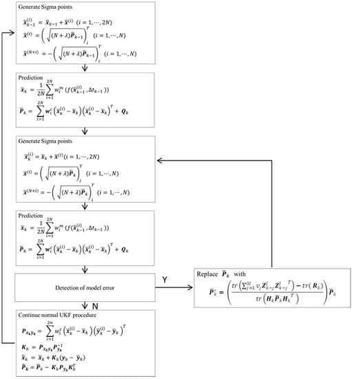 As analysed above, the predicted state covariance has the deviation due to model error . Using the deviation to correct the state covariance described by Equation (9) yields: