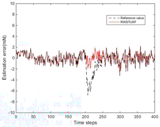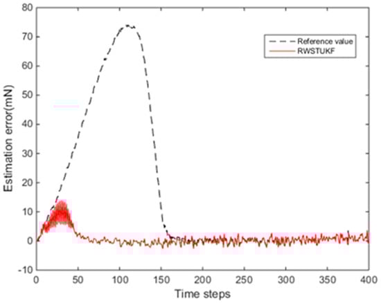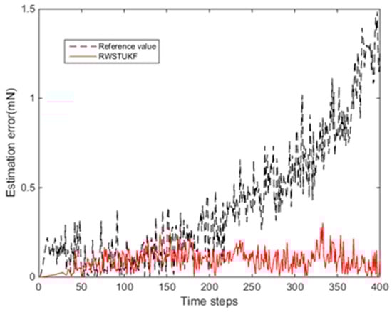 Figure 2 shows the estimation errors by both UKF and RWSTUKF under the initial state estimation error. Due to the influence of the initial error, the estimation error by UKF is rapidly increased and then converged after 150 time steps, leading to the maximum estimation error of 74.265 mN. However, the estimation error by RWSTUKF is converged only after 50 time steps, showing that the convergence speed of RWSTUKF is three times faster than that of UKF. The resultant maximum estimation error by RWSTUKF is 13.887 mN, which is about six times smaller than that by UKF. This is because RWSTUKF can dynamically adjust predicted state covariance to restrain the disturbance of the initial error on the filtering solution, leading to the improved estimation accuracy than UKF. Table 1 summarizes the estimation errors by both UKF and RWSTUKF. The mean error and RMSE (root mean square error) are 1.8092 mN and 2.9133 mN for RWSTUKF, whereas they are 2.9133 mN and 30.2395 mN for UKF.