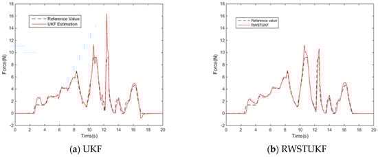 Figure 6 shows the reconstructed forces by both UKF and RWSTUKF with reference to the measured contact force. It can be seen that the UKF estimation involves a large error, leading to the maximum error of 9.6501 N. In contrast, the RWSTUKF estimation follows the reference force curve more closely, leading to the maximum error of 3.3760 N, which is almost three times smaller than that of UKF. This is because RWSTUKF has the capability to handle system model error by online correction of predicted state covariance. Table 4 lists the estimation errors of UKF and RWSTUKF. It can be seen that in addition to the maximum error, the mean error and RMSE of RWSTUKF are also much smaller than those of UKF.